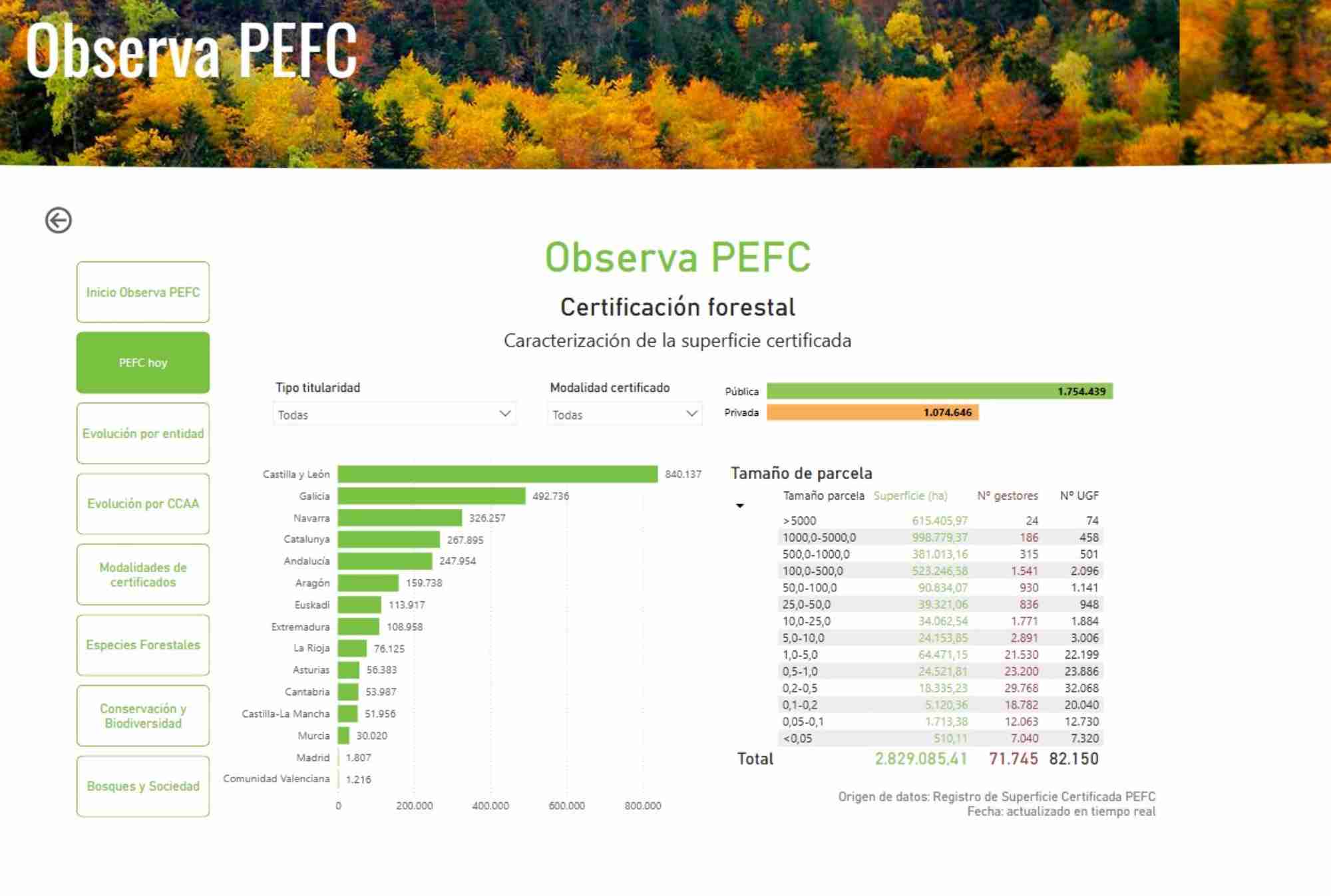 Los datos mostrados en Observa PEFC provienen del Registro de Superficie Certificada PEFC, que reúne información alfanumérica y cartográfica de todas las Unidades de Gestión Forestal (UGF) certificadas según el Sistema Español de Certificación Forestal PEFC. Esto permite realizar cruces de información temática con datos procedentes de fuentes oficiales, como información forestal o datos de población, lo que facilita una comprensión más profunda del monte certificado y su papel en el sector forestal.